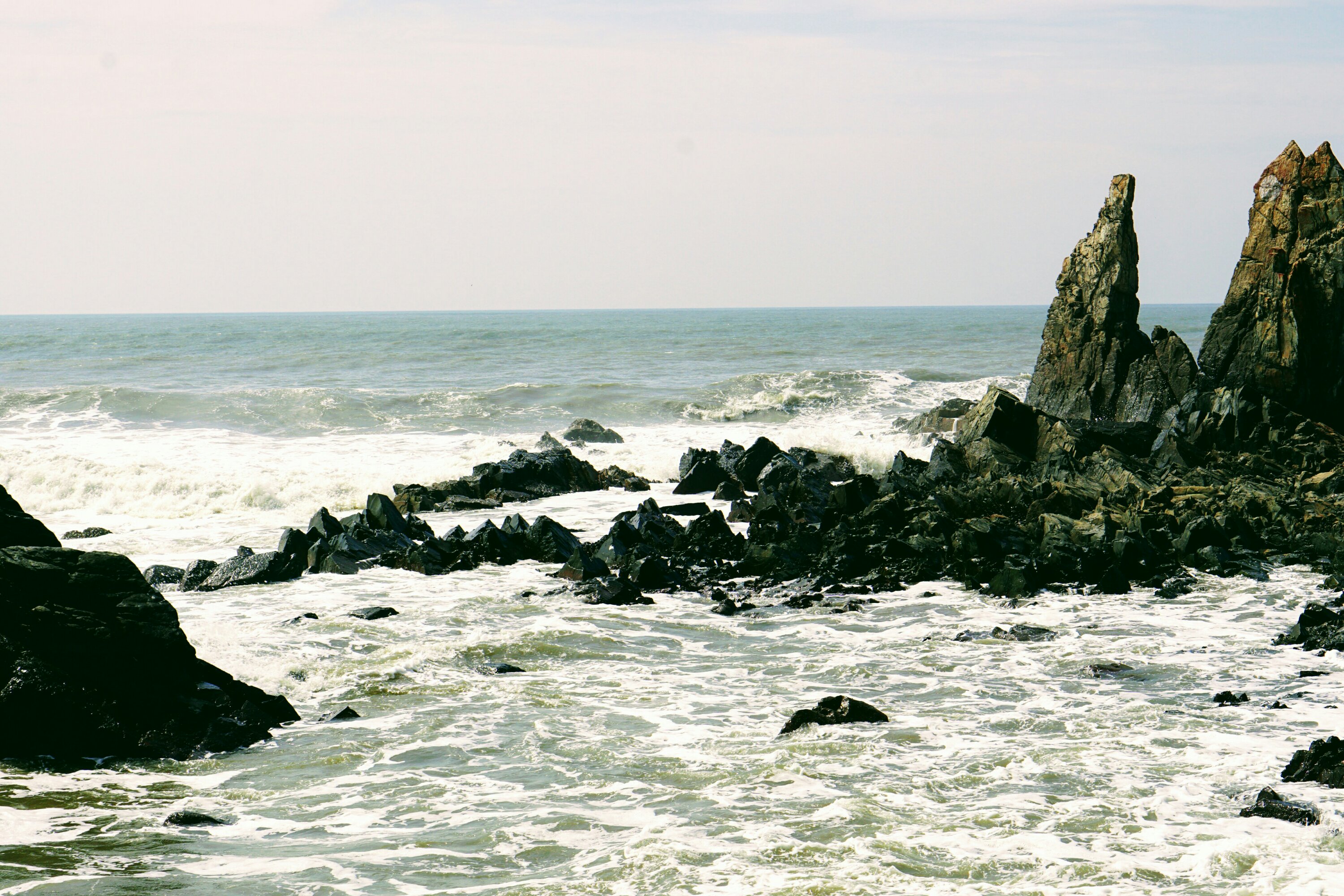 Der Sonnenuntergang bei den Felsen ist wunderschön. Das Meerwasser donnert gegen die Felsen und spritzt, sprudelt und schäumt. Wir sitzen auf den Felsen und beobachten die riesigen Wellen und den glühenden Feuerball.